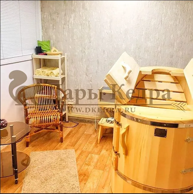 Финская сауна, купель и душевая кабина из кедра в центре здоровья и красоты «Релакс» (г. Новосибирск)