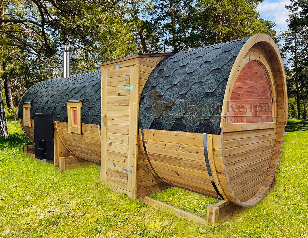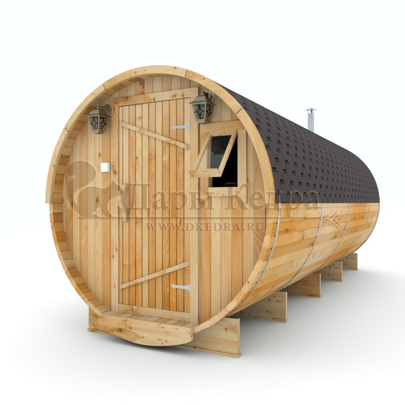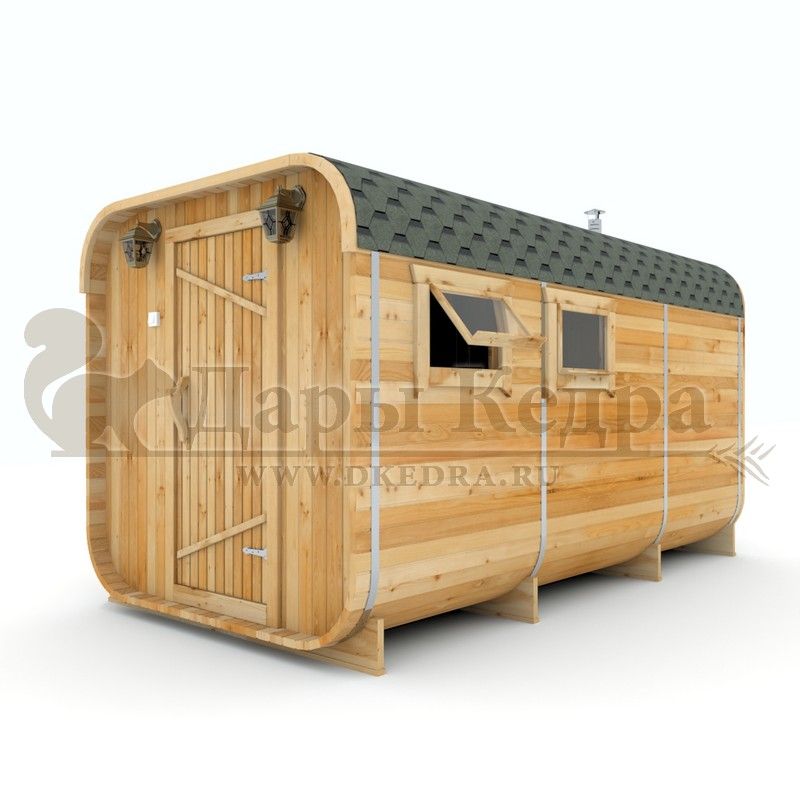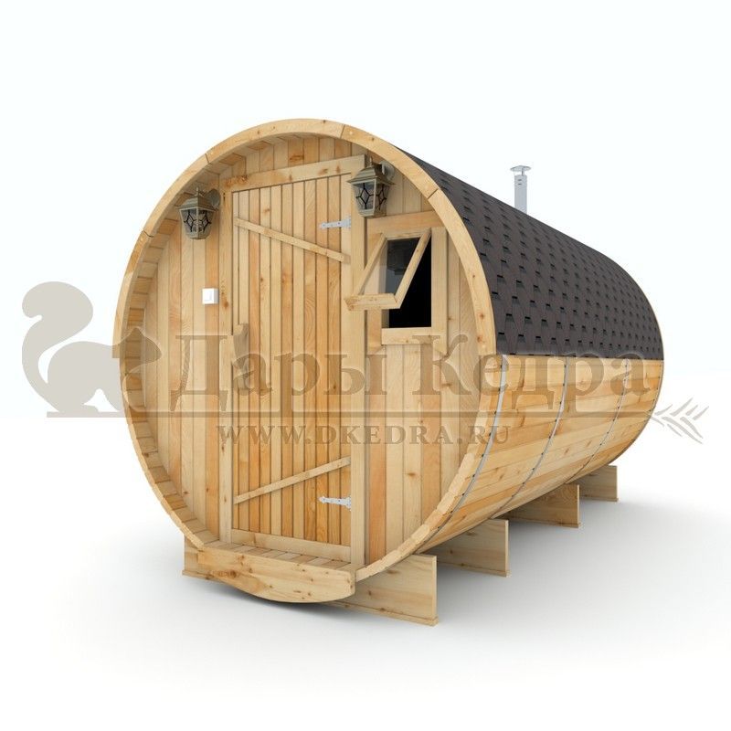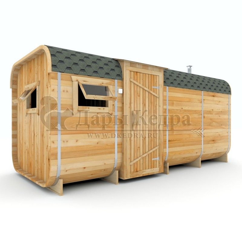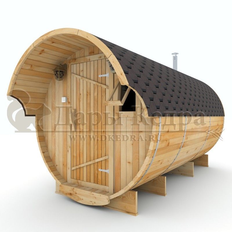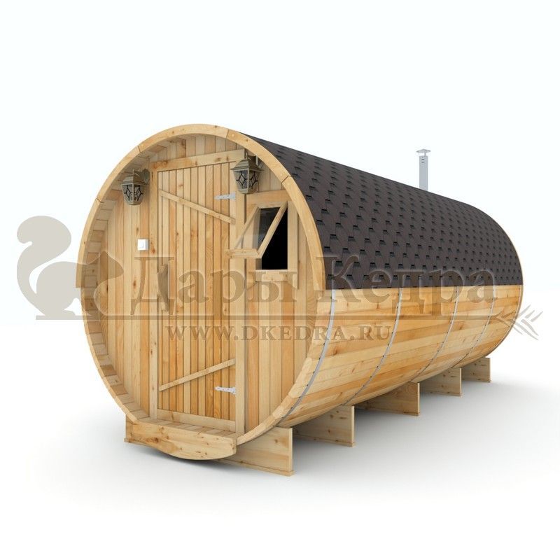 • Баня-бочка буханка из кедра с козырьком (все размеры) Баня-буханка более просторная за счет увеличенной высоты потолков и ровного пола. Козырек не только украшает баню, но и защищает оставленную обувь от дождя. Лавочки из кедра находятся по всей длине бани-бочки с обеих сторон. Печь расположена в парилке около дальней стены. Время растопки такой бани не превышает 30 минут. В зависимости от выбранного размера баня-бочка буханка с козырьком имеет следующую комплектацию: Баня-бочка буханка 2,5 метра - парилка; Баня-бочка буханка 3,5 и 4,5 метра - раздевалка, парилка; Баня-бочка буханка 5,5 метров - раздевалка, парилка, моечная. По вашему желанию ее можно укомплектовать печью с внешней загрузкой, благодаря которой весь мусор вовремя топки остается на улице. Баня-бочка буханка не требует полноценный фундамент, поэтому при необходимости ее можно перенести в другое место. Обращаем Ваше внимание, что в стандартную комплектацию бани входят полки открытого типа в парной с обеих сторон. Дополнительно можно заказать полок закрытого типа или лавку! Кедр обладает ароматическими свойствами. Он не деформируется и влагоустойчив, при правильном уходе за деревом на нем не развиваются грибки и плесень.