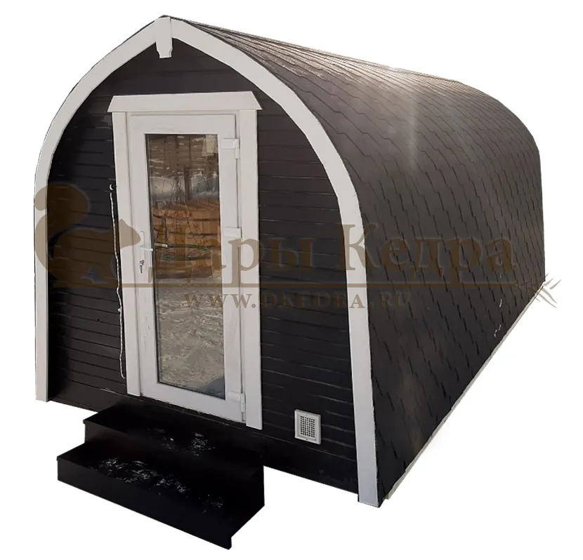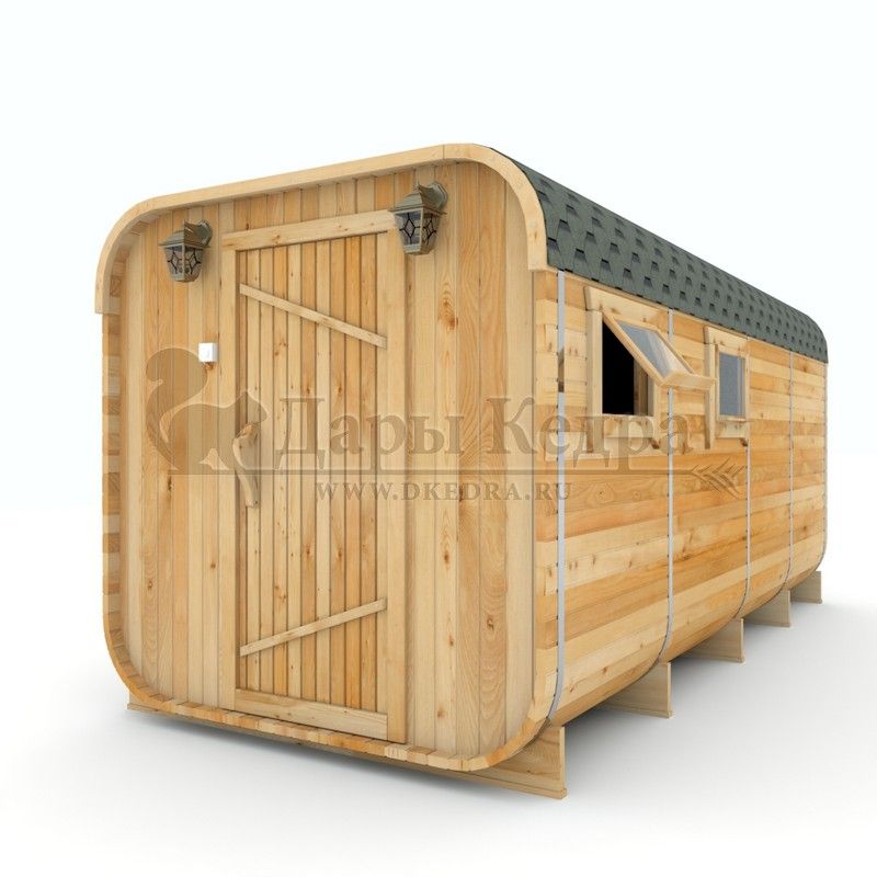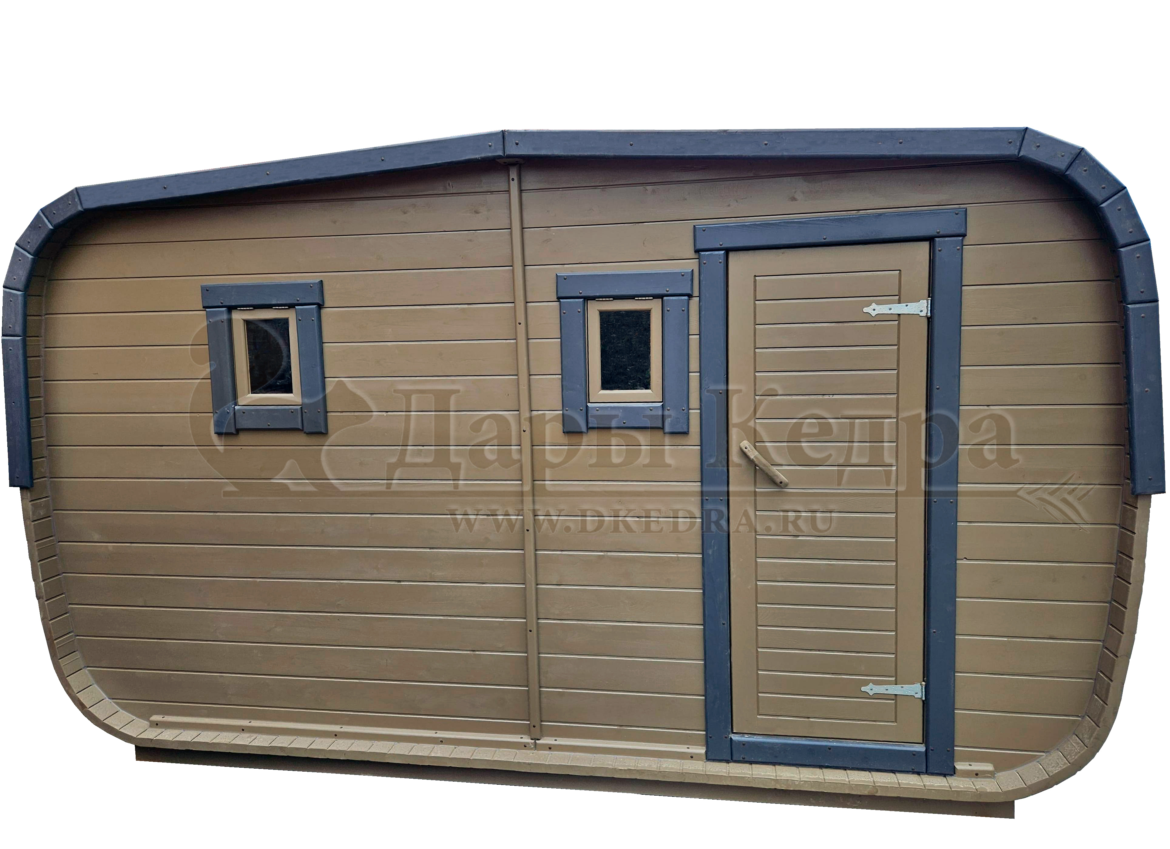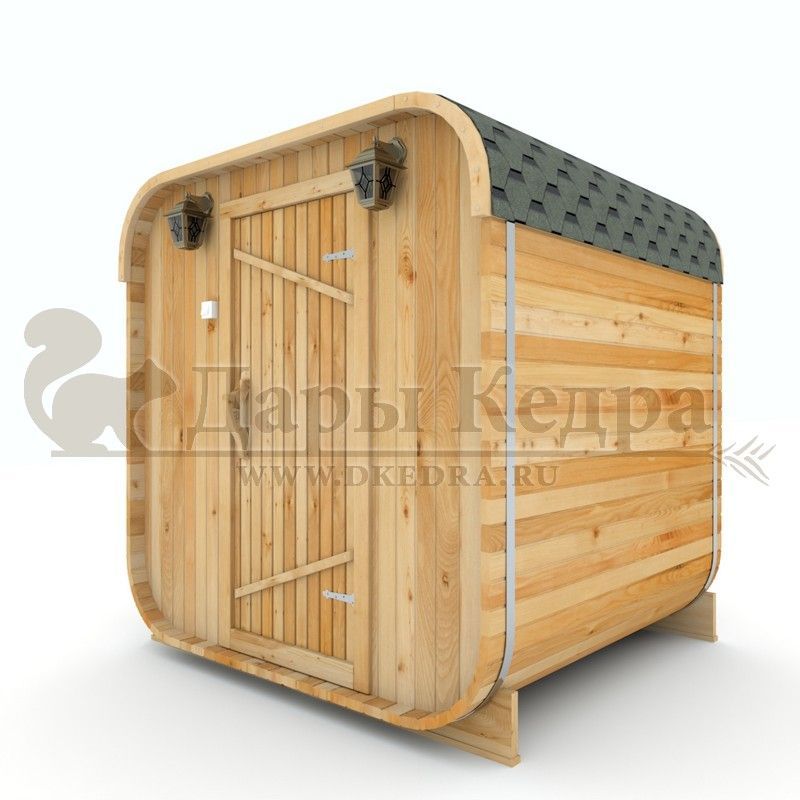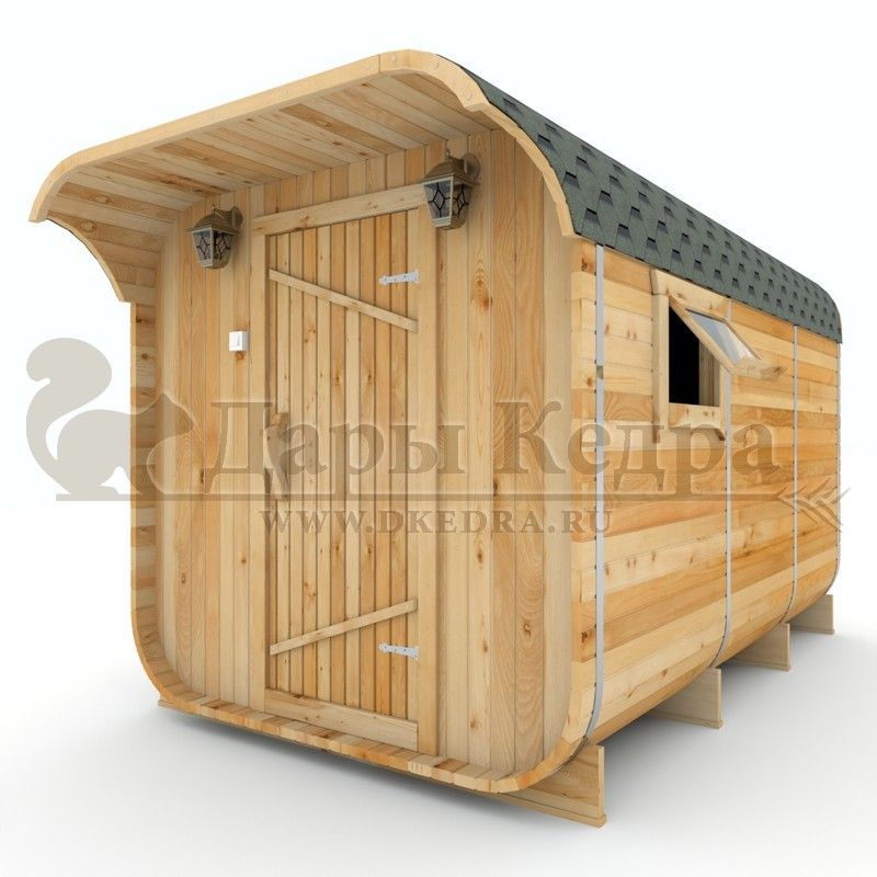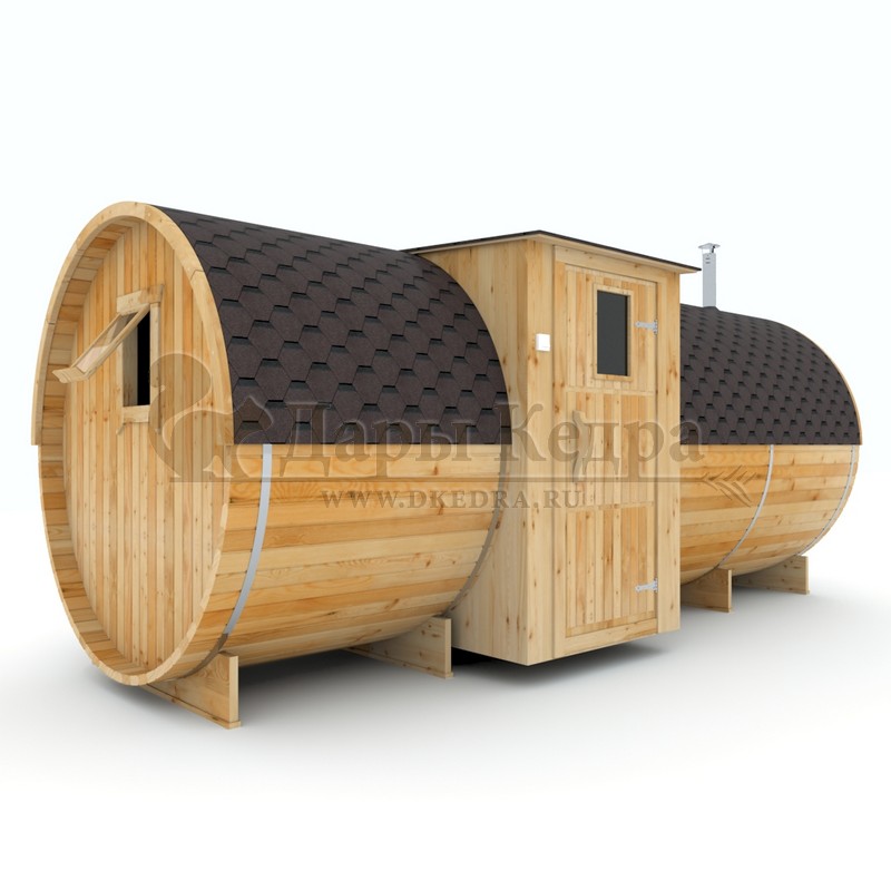 • Баня-бочка буханка из кедра с козырьком (все размеры) Баня-буханка более просторная за счет увеличенной высоты потолков и ровного пола. Козырек не только украшает баню, но и защищает оставленную обувь от дождя. Лавочки из кедра находятся по всей длине бани-бочки с обеих сторон. Печь расположена в парилке около дальней стены. Время растопки такой бани не превышает 30 минут. В зависимости от выбранного размера баня-бочка буханка с козырьком имеет следующую комплектацию: Баня-бочка буханка 2,5 метра - парилка; Баня-бочка буханка 3,5 и 4,5 метра - раздевалка, парилка; Баня-бочка буханка 5,5 метров - раздевалка, парилка, моечная. По вашему желанию ее можно укомплектовать печью с внешней загрузкой, благодаря которой весь мусор вовремя топки остается на улице. Баня-бочка буханка не требует полноценный фундамент, поэтому при необходимости ее можно перенести в другое место. Обращаем Ваше внимание, что в стандартную комплектацию бани входят полки открытого типа в парной с обеих сторон. Дополнительно можно заказать полок закрытого типа или лавку! Кедр обладает ароматическими свойствами. Он не деформируется и влагоустойчив, при правильном уходе за деревом на нем не развиваются грибки и плесень.