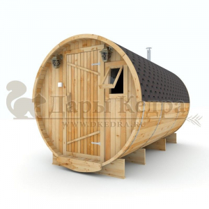 Это изделие круглой вытянутой формы с двумя отделениями: раздевалкой и парной. Лавочки из кедра находятся по всей длине бани-бочки с обеих сторон. Печь расположена в парилке около дальней стены. Для удобства пользования в раздевалке установлена вешалка и полочка из кедра. За счет небольшой конструкции баня нагревается не более 30 минут. По вашему желанию баню-бочку можно дополнить печью с внешней загрузкой, благодаря которой весь мусор после топки останется на улице. Круглая баня-бочка не требует полноценный фундамент, поэтому при необходимости ее можно перенести в другое место.