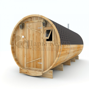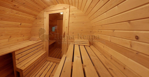 Это изделие круглой вытянутой формы с тремя отделениями: раздевалкой, моечной и парной. Во всех трех отделениях с обеих сторон установлены лавочки из кедра. Печь находится в парилке около дальней стены. Для удобства пользования в бане висят полочки из кедра и вешалка в раздевалке. Время растопки такой бани не превышает 30 минут. По вашему желанию баню-бочку можно дополнить печью с внешней загрузкой, благодаря которой весь мусор после топки останется на улице. Круглая баня-бочка не требует полноценный фундамент, поэтому при необходимости ее можно перенести в другое место.