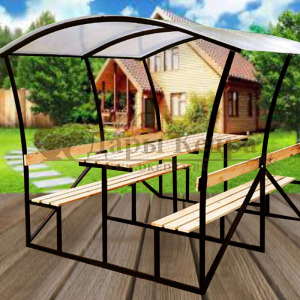 Беседка выполнена из стальной квадратной профильной трубы 40х40 мм. Лавки и стол обшиты кедровой доской. На крыше - поликарбонат. Беседка отличается простотой в установке, легкостью конструкции, долговечностью, прочностью и классическим дизайном, который впишется в любой интерьер приусадебного участка. Вокруг такой беседки можно организовать ландшафт из вьющихся растений, которые красиво создадут зеленые "стены" снаружи и уют внутри. Размер стола у разных моделей варьируется в зависимости от ширины конструкции.