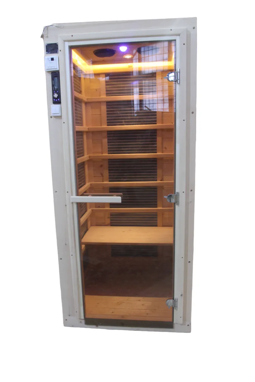 Это специально оборудованная кедровая кабина для прогрева тела человека сухим теплом. Воздух в таких парных не нагревается. Инфракрасные лучи воздействуют на тело, равномерно прогревая мышцы, суставы и органы. Карбоновые излучатели, встроенные в стены кабины, обладают мягким прогревом, что полностью исключает возможность ожога. Работает кабина за счет электричества. Инфракрасная сауна с карбоновыми излучателями подойдет как для домашнего использования, так и для коммерции.
