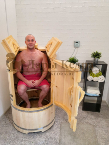 Готовый комплект - это полностью укомплектованный набор с фитобочкой для процедур парения. Круглая модель наиболее компактна и мобильна. Толщина стенок составляет 40-45 мм, что позволяет увеличить срок службы изделия. Бочка оборудована откидными створками, дверцей и отверстием для головы. Верхний скос делает положение головы более комфортным и улучшает обзор. Во время парения человек сидит внутри кедровой бочки, а голова находится снаружи. Благодаря этому исключается возможность перегрева. Подлокотники из кедра, встроенные ручки на створках и двери делают эксплуатацию более удобной.
