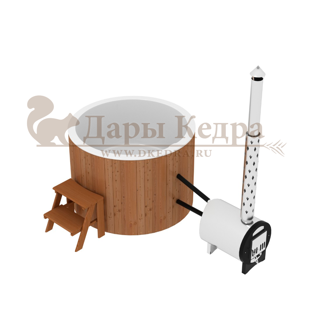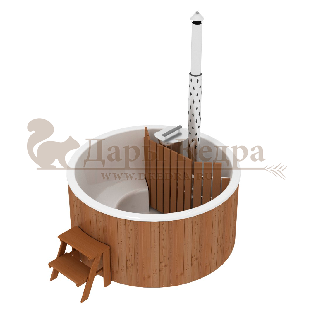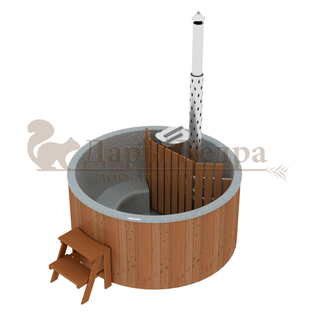 • Финская круглая композитная купель с подогревом (с печкой) «Премиум 220 40 квт» Это уличная подогреваемая купель с круглой внутренней чашей, которая изготовлена из современного прочного и термоустойчивого материала (композита). Форма чаши обеспечивает комфортную посадку во время принятия процедур. Для удобства пользования купель фурако оборудована приставной лестницей. Нагрев воды осуществляется за счет встроенной печи, которая находится внутри купели за перегородкой из кедра. В комплектацию этой модели входит савок с длинной ручкой, который позволяет извлекать угли после эксплуатации изделия. Композитная вставка придает купели красивый внешний вид, продлевает срок службы и облегчает уход за изделием. Парение на свежем воздухе – это отличный способ укрепить здоровье и поддержать организм в тонусе.