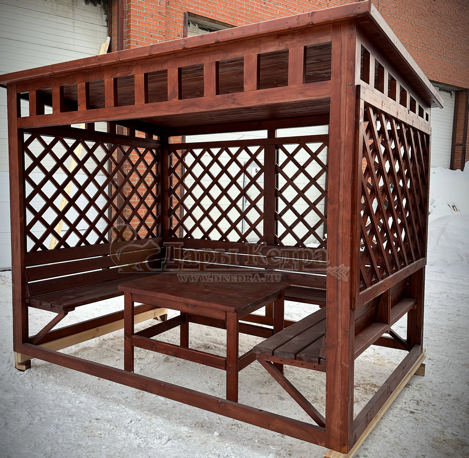 Беседка из дерева Беседка выполнена из кедра. На крыше - ондулин. Конструкция отличается простотой в установке, легкостью, долговечностью, прочностью и классическим дизайном, который впишется в любой интерьер приусадебного участка. Вокруг неё можно организовать ландшафт из вьющихся растений, которые красиво создадут зеленые 'стены' снаружи и уют внутри.