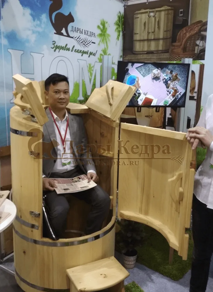Горизонтальная двухрежимная фитобочка из кедра может быть использована как инфракрасная сауна и парная. Карбоновые излучатели отвечают за сухое парение и находятся на внутренней стороне дверцы. Влажное парение происходит за счет поступления горячего пара в фитобочку через паропровод. Горизонтальная форма позволяет принимать процедуры лежа. Внутренняя ручка из кедра облегчает открывание и закрывание двери во время парения. Такая модель наиболее удобна для оздоровительных центров.